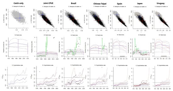 The output of the CMSY++ (CMSY and BSM models) using catch-only data (column 1) and the catch-per-unit effort (CPUE) indices (from columns 2 to 7) of the joint CPUEs of Brazil, Taiwan, China, Spain, Japan, and Uruguay. Row 1 displays the r/k pairs found by CMSY catch-only and the BSM when using the full catch time series (from 1971 to 2020) with the dark grey points indicating possible r–k pairs found by the CMSY model and black dots indicating possible r–k pairs found by the BSM model. The blue crosses indicate the most probable r–k pairs found by the CMSY (catch-only) and the red crosses indicate the most probable r–k pairs found by the BSM and their 95% confidence limits. Row 2 shows the estimated biomass relative to K (red), i.e., the CPUE data, scaled to the BSM estimate of Bmsy = 0.5 k, and the biomass trajectory estimated by CMSY in blue. Dotted blue and red lines indicate the 2.5th and 97.5th percentiles. The dots indicate the CPUE data scaled and corrected by BSM, and the green line indicates the uncorrected CPUE. Vertical purple lines indicate the prior biomass ranges. Horizontal dashed and dotted black lines indicate the 0.5 and 0.25 biomasses (BMSY), respectively. Row 3 indicates the exploitation rate estimated from the BSM (red) and the CMSY (blue). The black horizontal–dotted line indicates where F/Fmsy = 1.