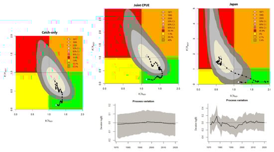 The process variation figures show the deviation between deterministic expectation (surplus production minus catch) and stochastic realization (after adding process errors); a strong deviation of the bold curve from the dashed line indicates that changes in biomass diverge from the Schaefer model expectations, perhaps due to the CPUE not properly describing the abundance or the priors being mis-specified (Froese et al., 2021). Slight deviations could be observed for the Japanese CPUE run and an insignificant change was observed when the CPUEs were combined.