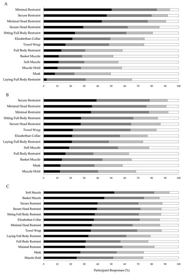 Participants were presented with visual and written descriptions of 13 different handling techniques based on techniques represented in Dr. Sophia Yin’s book, “Low Stress Handling, Restraint, and Behavior Modification for Dogs and Cats” [10] and recommended within other peer-reviewed literature [7,20]. The recommended handling techniques selected for use in the survey included: muzzles, mask (material placed over the eyes and clipped behind the head), towels (towel wrapped around the neck), Elizabethan collars (cone shaped collar placed around the head), head restraint (neck secured by holding the head against handlers’ body), muzzle hold (hands holding the mouth shut), minimal restraint (hands placed on the shoulders), and full body restraint (entire body held down on its side). For the full list of techniques used and detailed descriptions see Supplementary Information, File S1.