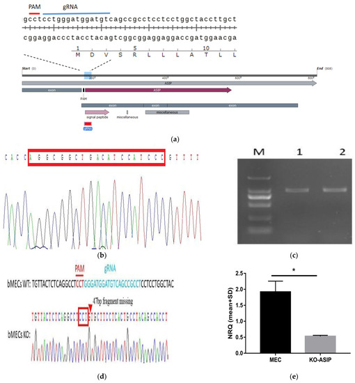 Construction of ASIP bMECs line: (a) gRNA’s location in the CDS region; (b) Sequencing map of positive bacterial liquid constructed by gASIP/PX459 vector; (c) ASIP knockout PCR validation of KO-ASIP MECs (M: market, 1: WT MEC, 2: KO-ASIP MEC); (d) Sequencing results of cell ASIP PCR products; (e) mRNA level validation of ASIP knockout (Ko-ASIP is an ASIP knockout bMECs. MEC is a wild-type bMECs. Error bars indicate SEM. * p < 0.05).