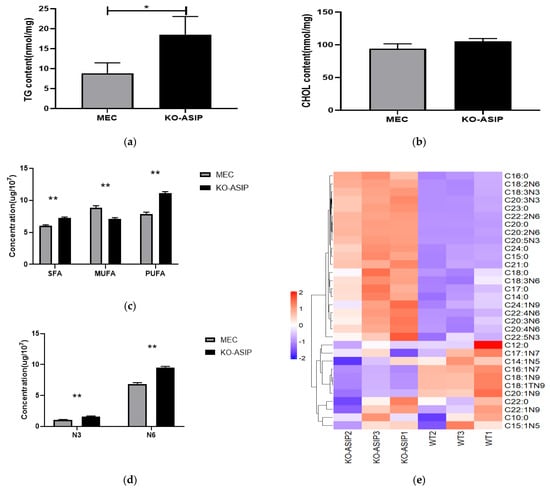 The results showed that the intracellular triglyceride content was increased (p < 0.05), and the cholesterol content was not significantly changed in the ASIP knockout bMECs (Figure 2a,b). Fatty acids were extracted from the wild-type and the ASIP gene knockout cells, respectively. The composition and content of the fatty acids were analysed. There were significant reductions in monounsaturated fatty acids (MUFA) and saturated fatty acids (SFA), and polyunsaturated fatty acids (PUFA) in KO-ASIP compared to WT. Both polyunsaturated fatty acids ω-3 (N3) and polyunsaturated fatty acids ω-6 (N6) were elevated significantly in KO-ASIP bMECs (p < 0.05, Figure 2c,d). Furthermore, a total of 39 fatty acids were detected. In ASIP knockout cells, the level of saturated fatty acids C14:0, C15:0, C16:0, C17:0, C18:0, C20:0, C21:0, C24:0 and polyunsaturated fatty acids such as C18:2N6, C18:3N6, C18:3N3, C20:2N6, C20:3N6, C20:4N6, C20:3N3, C20:5N3, C22:2N6, C22:5N3, C24:1N9 was significantly higher than that in WT. A significant increase of C16:1N7, C18:1TN9, C18:1N9, and C20:1N9 occurred in ASIP knockout bMECs. No significant differences were found in the other 16 fatty acids (p < 0.05, Figure 2e,f, Table 3).