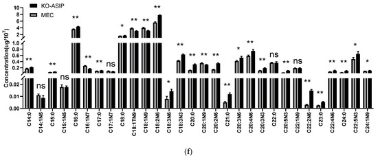 The effect of ASIP on TGs, CHOL and FA contents in bMECs: (a) The TG content in the cell; (b) The CHOL content in the cell; (c) The total content of various fatty acids in a cell; (d) The total content of N3 and N6 fat acids in a cell. Error bars indicate SEM; (e,f) Any of various medium and long-chain fatty acids in the cell. Error bars indicate SEM. * p < 0.05, ** p < 0.01, ns: p > 0.05.