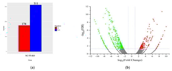 Transcriptome sequencing analysis after ASIP knockout: (a) Number of genes differentially expressed by KO-ASIP and NC; (b) Volcano map of differential genes, red dots of significantly different genes indicate up-regulation, green dots indicate down-regulation; the abscissa represents the change of gene expression multiple in different samples. The ordinate represents the statistical significance of changes in gene expression levels; (c) Differential gene cluster plots were clustered with log10 (rpkm1) values, red for high expressed genes and blue for low expressed genes. Colours range from red to blue, indicating higher gene expression; (d) Rich distribution map of GO Term; (e) Rich distribution map of KEGG gene (KO is KO-ASIP bMECs and NC is WT bMECs).