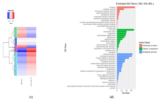 Total RNA was extracted from the bMECs by TRIzol reagent (Invitrogen, Carlsbad, CA, USA). The RNA quality detection was carried out using the Agilent bioanalyzer 2100 (Agilent Technologies, Palo Alto, CA, USA). A total of 1 μg RNA with RIN value above 7 was used following library preparation. Next-generation sequencing library preparations were constructed according to the manufacturer’s protocol (NEBNext® Ultra™ RNA Library Prep Kit for Illumina®). The poly(A) mRNA was captured with NEBNext® Poly(A) mRNA Magnetic Isolation Module (NEB, Beijing, China). The mRNA fragmentation and priming were performed using NEBNext First Strand Synthesis Reaction Buffer and NEBNext Random Primers. First-strand cDNA was synthesized using ProtoScript II Reverse Transcriptase, and the second-strand cDNA was synthesized using Second Strand Synthesis Enzyme Mix. The RNA libraries were structured using cDNA NEBNext Ultra RNA Library Prep Kit for Illumina and purified by Beckman Agencourt AMPure XP beads (Beckman Kurt, Shanghai, China). Library detection and quantification were carried out using Agilent bioanalyzer 2100 and Qubit. TruSeq PE Cluster Kit V4 was used for cBOT automatic mounting. The HiSeq sequencing was implemented using TruSeq SBS Kit v4-HS. DEGs were analysed between KO-ASIP and WT bMECs using the DESeq Bioconductor package [20]. This analysis was based on the negative binomial distribution and was adjusted using Benjamini and Hochberg’s approach for controlling the false discovery rate. The fluorescent quantitative PCR validation assay was performed using |log2FC| ≥ 1.5 and p < 0.05 as screening conditions for differential gene expression, and 10 genes related to lipid metabolism and related marker genes were selected for quantitative validation. The gene ontology (GO) analysis of DEGs was conducted by the Cluster-Profiler R package [21], in which the gene length bias was corrected. The GO terms with corrected p < 0.05 were significantly enriched by DEGs. The KEGG is a database resource for understanding high-level functions and utility of the biological systems from molecular-level information (http://www.genome.jp/kegg/ (accessed on 6 February 2018)). We used the cluster Profiler R package software to test the statistical genes.