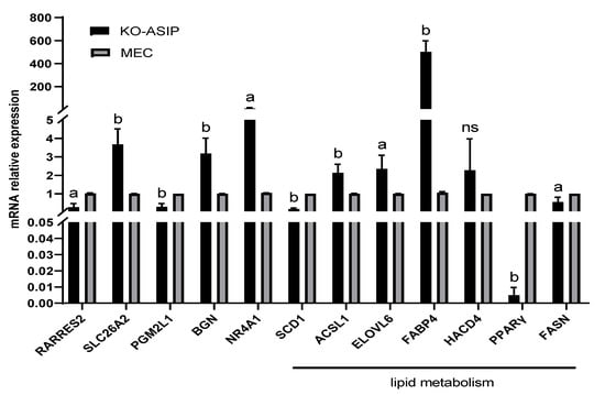 Quantitative results of genes related to fatty acid metabolism pathway. Error bars indicate SEM. a: p < 0.05, b: p < 0.01, ns: p > 0.05.