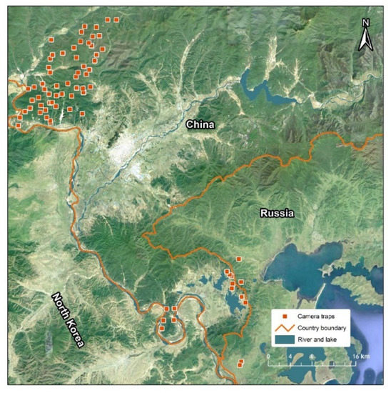 A camera-trapping survey for this study was conducted in Hunchun, Jilin Province, China, and in Southwest Primorsky Krai region of the Russian Far East, located in the transboundary area of the downstream Tumen River (Figure 1). The Tumen River marks the border between China and North Korea; further downstream, a 15 km area marks the boundary between Russia and North Korea. The area is a temperate coniferous broadleaved mixed forest with a mild climate and high biodiversity, inhabited by many important flagship species or subspecies of Northeast Asia, such as the Amur tiger (Panthera tigris altaica) and Amur leopard (P. pardus orientalis), red-crowned crane (Grus japonensis), white-naped crane (Antigone vipio), white-tailed eagle (Haliaeetus albicilla), and chum salmon (Oncorhynchus keta) [14].