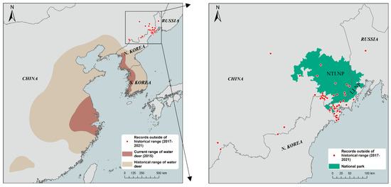 Range of the water deer. Historical range according to Whitehead (1993) [23] is shown in light tan, and current range in China and Korea peninsula according to the IUCN Red List is shown in dark tan [1], while red dots indicate individual recordings of water deer outside of the historical range. Green area (right) indicates the Northeast Tiger and Leopard National Park of China (NTLNP) and the Land of Leopard National Park of Russia (LLNP).