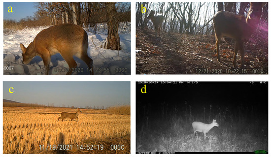 Photographs of water deer captured by camera-traps in the expansion areas in China and Russia. (a) A male in forest wetlands: 14 January 2020, (b) a female with fawns in the deciduous forests: 12 December 2020, (c) a male in rice paddies: 19 November 2021, and (d) a male in seasonal swamps: 24 October 2019.