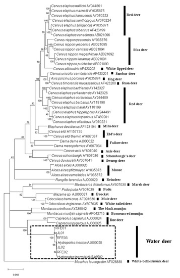 - Gilbert, C.; Ropiquet, A.; Hassanin, A. Mitochondrial and nuclear phylogenies of Cervidae (Mammalia, Ruminantia): Systematics, morphology, and biogeography. Mol. Phylogenet. Evol. 2006, 40, 101–117. [Google Scholar] [CrossRef] [PubMed]