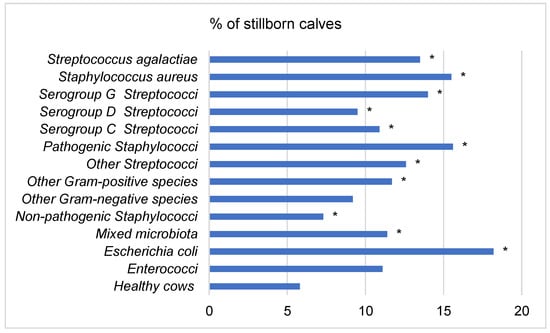 Percentage of stillborn calves in groups of cows. *—The difference within the group of healthy cows is statistically significant (p < 0.05).