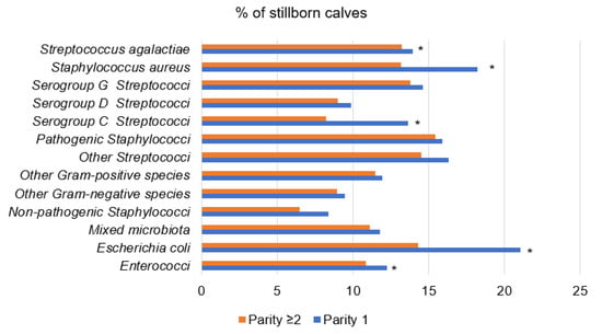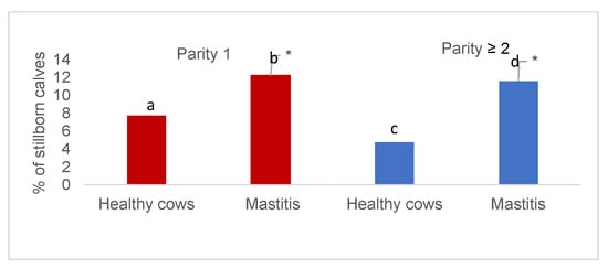 Percentage of stillborn calves by group of cows according to mastitis agent and parity. *—the difference between the frequencies of the parities groups is statistically significant (p < 0.05).