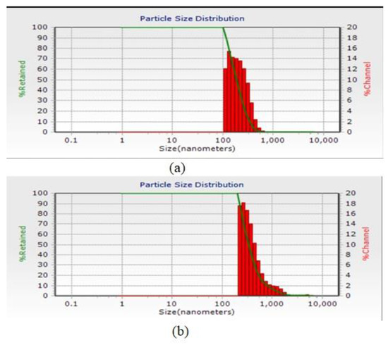 Particle size distribution diagram of microcapsules after formation: (a) chitosan nanoparticles and (b) calcium alginate nanoparticles.