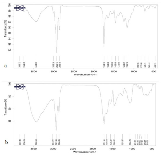 Infrared spectroscopy is a tool to study the state of bonds and microstructure of materials in organic chemistry—in other words, to study hydrogen bonds and other reactions in addition to the ability to combine polymers. Since different functional groups have absorption at certain frequencies and changes in the structure of materials cause changes in absorption frequencies, IR spectroscopy is introduced as a suitable tool for detecting and displaying structural changes in the method. As can be seen, the general structure of the peaks for both samples is very similar to each other. The ones observed in 623.44 and 777.81 are related to the off-plane bends of C-H bonds of phenolic rings [51]. The peaks of 817.80 and 819.56 are related to the asymmetric tensile vibrations of P-O and observed in 1165.18 are related to the asymmetric tensile vibrations of C=O. The peak in 1376.69 in calcium alginate is related to symmetric bending vibration C-H, which is not present in chitosan. The peaks of 1405.62 and 1459.05 correspond to the flexural vibrations of C-H, and the peaks of 1650.13 show the tensile vibrations of the C=C double bonds, which indicate the helical structure of the second wave. The peak of 1744.74 tensile vibrations is C=O, and the peaks observed in area 2856 belong to the CH2 and CH3 groups of symmetric tensile vibrations. The peaks in the 2924.95 and 1326.1326 CH2 groups are asymmetric tensile vibrations of the methylene groups in the phenolic rings, and the peak of 30.77 is related to the tensile vibrations =C-H. The chitosan spectrum shows a strong and wide peak at 3433.54, which in calcium alginate has reduced the intensity of this peak and indicates the overlap caused by the bonding of hydrogen bonds by the tensile vibrations of O-H and N-H.