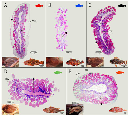 - Koya, Y.; Muñoz, M. Comparative study on ovarian structures in scorpaenids: Possible evolutional process of reproductive mode. Ichthyol. Res. 2007, 54, 221–230. [Google Scholar] [CrossRef]