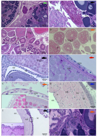 - Muñoz, M.; Casadevall, M.; Bonet, S. The ovarian morphology of Scorpaena notata shows a specialized mode of oviparity. J. Fish Biol. 2002, 61, 877–887. [Google Scholar] [CrossRef]