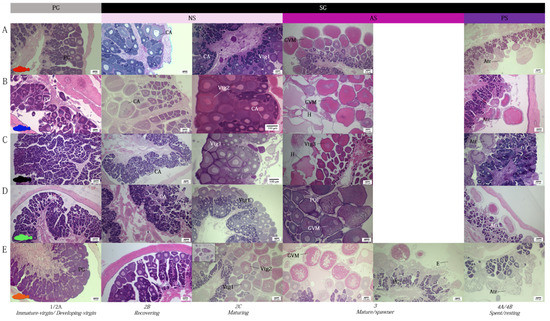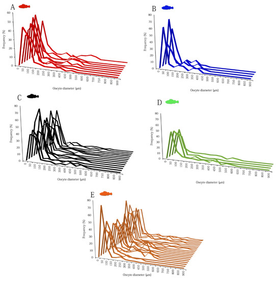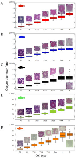 - West, G.J. Methods of assessing ovarian development inn fishes: A review. Aust. J. Mar. Freshw. Res. 1990, 41, 199–222. [Google Scholar] [CrossRef]