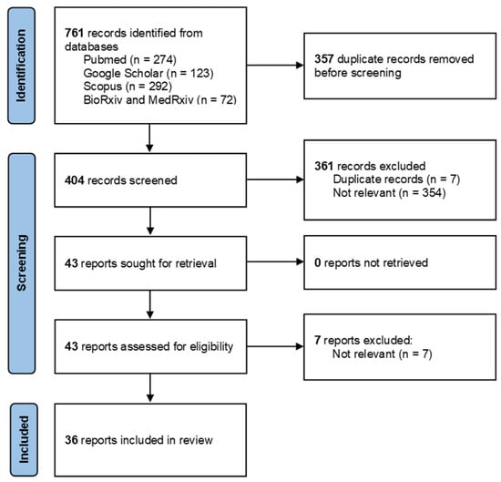 Combining all four databases, the search strategy yielded 761 records in total, including both peer-reviewed articles and preprints. After duplicate removal, 404 records were title–abstract screened. Moreover, 43 full-text records were then assessed for eligibility, of which 36 records were included in the final scoping review. The article selection process can be seen in more detail in Figure 1 [16].