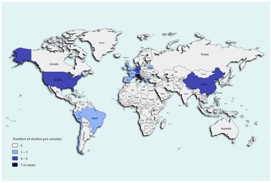 Number of studies included in the review per country. With seven studies, the highest number of studies was performed in Italy. In both China and Germany, there were five studies, while in the USA, four studies were conducted. In all other countries (Belarus, Belgium, Brazil, Chile, Greece, Netherlands, Northern Cyprus, Peru, Spain, Switzerland, and the United Kingdom) either one or two studies were performed.