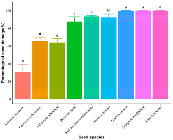 Percentage (mean % ± SD) of the destruction of nine seed species ingested through captive Tibetan macaques (Macaca thibetana) and the differences in the percentage of seed destruction (PSD) between seed species. The seeds are arranged according to MCD from smallest to largest. Different letters indicate significant differences (p < 0.05) among groups.