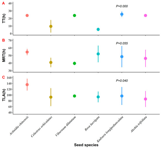 Relationships between seed species and three passage time parameters: (A): time of the first appearance of a seed (TT); (B): mean retention time (MRT); (C): time of the last appearance of a seed (TLA). The dots represent the mean and the bars show the standard deviation (SD).