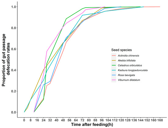 The mean values of the passage times (TT, TLA, and MRT) of the six seed species in the gut were 18.8 h (range: 4–24 h), 100.4 h (range: 48–168 h), 47.0 h (range: 32.0–70.3 h), respectively (Figure 2). The results showed a significant correlation between MRT and TLA (Spearman’s correlation analyses, rs = 0.763, p < 0.001), the rest were not (Spearman’s correlation analyses, MRT and TT: rs = 0.113, p = 0.553; TLA and TT: rs = 0.278, p = 0.137). The results of testing the differences in the passage time variables on seed species showed that TT (Kruskal–Wallis test: χ2 = 23.54, df = 5, p < 0.001) and TLA (one-way ANOVA: F5,24 = 2.789, p = 0.040) differed significantly among the seed species, but not MRT (Kruskal–Wallis test: χ2 = 10.810, df = 5, p = 0.055) on seed species (Figure 2). The temporal distribution of the passage of different seed species shows that 58–81% of the seeds were passed within 48 h, while up to 72 h, 84–98% of the seeds were passed (Figure 3). Seeds ingested by Tibetan macaques were defecated between 100 and 168 h after feeding (Figure 3).