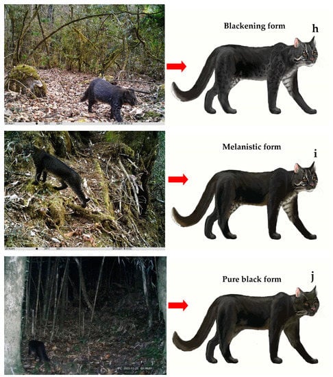 - Melanistic form: The overall coat color is jet black or dark gray-black, without obvious markings. This type corresponds to the common name or the trade names “black leopard” and “clouded leopard” in early fur acquisitions (Figure 2i).
