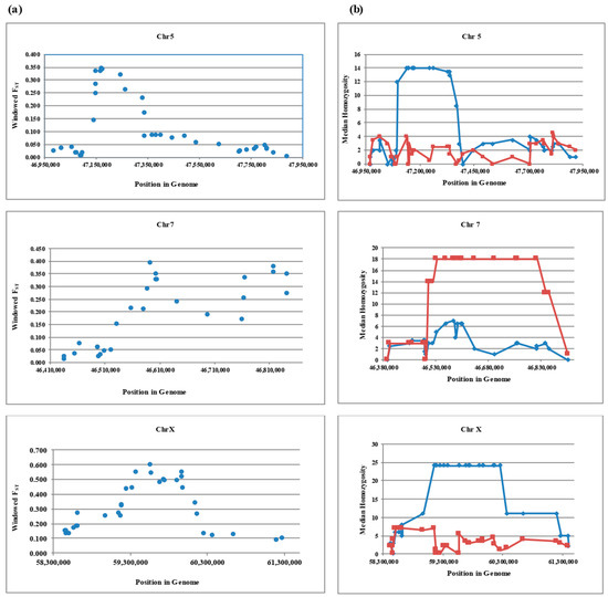When there is a selection for a causal mutation in one breed and not the other, the breed under selection shows high homozygosity in a genomic interval while the other does not [39]. To further test this hypothesis, median homozygosity was calculated and plotted against genomic position for candidate regions (Figure 1b). The results indicate that homozygosity increased over the areas of interest on chromosome 5 and X for the fat tailed and at the candidate region on chromosome 7 for the thin tailed breed. The largest differences of median homozygosity were for chromosome X and homozygosity was present for a longer distance as well, whereas these parameters are less on Chromosome 5.