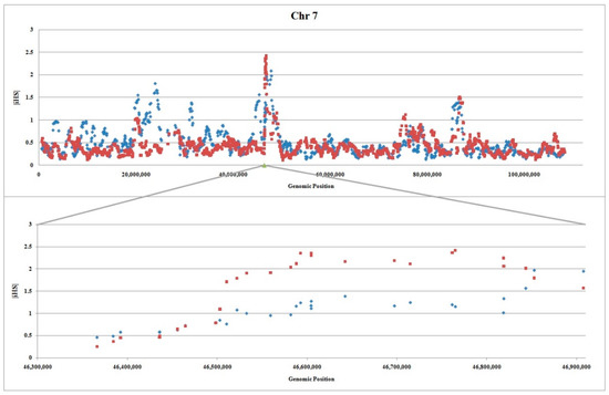 iHS detects signatures of strong selection in favor of alleles that have not yet reached fixation [35]. The results revealed that regions on chromosomes 5 and X had no iHS peak (Supplementary Figures S1 and S2). This observation may suggest that selected alleles have already been fixed in these locations. However, analysis of the region on chromosome 7 displayed an obvious peak in both thin and fat tail breeds (Figure 2). For most locations of the region the values are higher in the thin tail breed, however, there is also some even stronger indication of selection in fat tail breed especially at the end of the region.