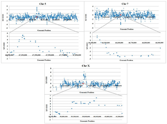 Finally, fine mapping of candidate regions using different sweep statistical tests has enabled us to confirm the signature of selection in these chromosomal regions and better refine the critical regions from 113 kb (47,149,400–47,263,230) to 28 kb (47,146,931–47,175,489) on chromosome 5, from 201 kb (46,642,359–46,843,356) to 142 kb (consisting to shorter intervals: 46,587,943–46,642,359 and 46,765,080–46,852,870) on chromosome 7 and from 2831 kb (58,621,412–61,452,816) to 1006 kb (59,257,971–60,264,325) on chromosome X. These regions were refined considering all statistical test results (Supplementary Figure S4). Acquiring of the genes located within the regions of interest after fine mapping revealed some genes consisting TCF7 on chromosome 5, PTGDR and NID2 on chromosome 7 and finally AR on chromosome X that have a multiple effect on lipid metabolisms, macromolecule metabolic process, organ/gland development or associated with ectopic expression of organs simultaneously.