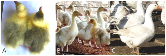 Color change process of Holdobaggy geese in different growth stages. Note that (A) is the gosling’s newborn (1–2 days old) with black and gray feathers on their backs and some heads; (B) is the young goslings aged 4–6 weeks in the molting stage with white feathers on their backs; (C) is the adult geese with white feathers on their whole body.