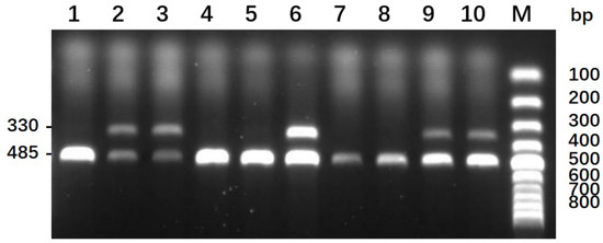 The PCR results are consistent with the expected target band size. As shown in Figure 2, lanes 1, 4, 5, 7, and 8 are single bands, about 485 bp in size, which can be judged as male geese embryos, and lanes 2, 3, 6, 9, and 10 are double bands, sized about 330 bp and 485 bp, which can be judged as female geese embryos.