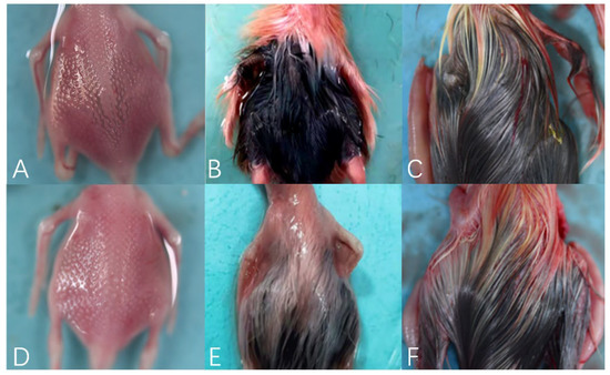 Visual observation of dorsal skin feathers development of Holdobaggy geese during embryonic stage. Note: (A–C). Visual observation of dorsal skin feathers development of female Holdobaggy geese embryos at E13, E18, and E28, respectively, and (D–F) Visual observation of dorsal skin feathers development of male Holdobaggy geese embryos at E13, E18, and E28, respectively.
