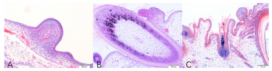 Microscopic observation of geese embryo skin at three different developmental stages by HE. Note: (A) primordial period of primary feather follicles at embryonic day 13, (B) primordial period of secondary feather follicles at embryonic day 18, and (C) greater developmental period of secondary feather follicles at embryonic day 28. Magnified: 10×; Bar: 100 μm.