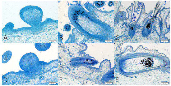 With the Fontana-Masson silver staining method, melanin granules (melanocytes and argyrophilic cells) were black, and other cells appeared pink through the reduction of melanin. Therefore, the melanin and lipofuscin were black, and other cells were blue or uncolored with Nile blue staining. By combining the two specific stains for melanin, the distribution of melanin in skin feather follicles could be clearly observed. The staining results showed that melanin was mainly distributed on the surface of the feather buds at E13, with small amounts of melanin deposited in female geese, while there was no obvious distribution of melanin in male geese (Figure 5).