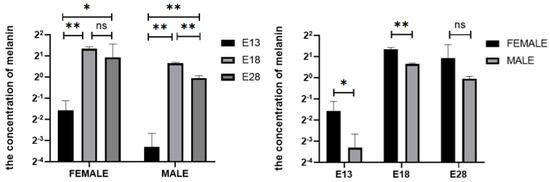 Furthermore, the melanin content significantly differed between male and female geese in E13 and E18 (p < 0.05), but no differences were noted between E18 and E28 (p > 0.05), with the highest melanin content observed in females than in males at each time point. Combined with the previous visual observations of dorsal feather color and staining of dorsal tissues at these three time points, melanin deposition followed the same trend as melanin content (Figure 6).