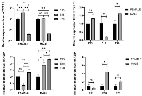 The expression of TYRP1 and ASIP genes in Holdobaggy geese dorsal skin feather follicles during embryonic stage. Note: ns no significant difference (p > 0.05), * Significant difference (p < 0.05), ** extremely significant difference (p < 0.01). The results are expressed as the mean ± SEM. n:3.