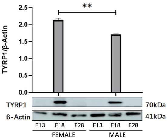 The Western blot results confirmed that the expression level of TYRP1 protein at E18 was significantly different from E13 and E28 at all three points in the embryos of the Holdobaggy geese (p < 0.01). Only E18 was expressed, and the expression in female geese was higher than in male geese at this time point (p < 0.01) (Figure 8).