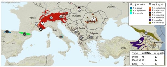 Geographic distribution of the subspecies of the genus Rupicapra. The map was modified from the distribution map on the IUCN Red List []. The affiliation to Clades West, Central, and East of extant populations of chamois for the mtDNA and nuclear markers (microsatellites and introns) is represented by forms colored in black, grey, and white, respectively.