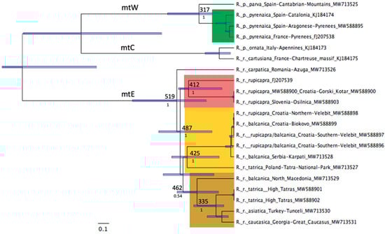 The Bayesian tree obtained with BEAST includes complete mtDNA sequences from the ten subspecies of chamois. The tree was rooted with Capra ibex (not shown). The Clades mtW, mtC, and mtE are indicated. The value above the subclade nodes corresponds to the mean age estimate of the nodes in thousand years, with 95% credibility intervals indicated by the blue bars. The Bayesian posterior probabilities are shown below the nodes. The colored rectangles highlight subclades within the main clades.