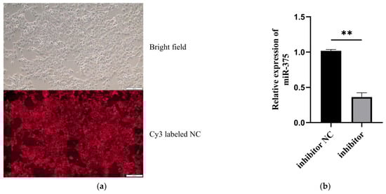 The miR-375 silencing efficiency in MAC-T. (a) Cy3-labeled inhibitor NC transfected into the cells detected using an inverted fluorescence microscope. (b) Analysis of miR-375 silencing efficiency in MAC-T using qPCR, ** p < 0.01.