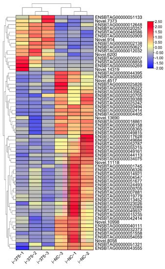 Inhibition of miR-375 dysregulated the expression of 63 mRNAs. A total of 48 mRNAs were significantly down-regulated, whereas the remaining 15 were significantly overexpressed (Table S3). We found that inhibition of miR-375 promotes expression of nuclear receptor subfamily 4 group A member 1 (NR4A1) and protein tyrosine phosphatase non-receptor type 5 (PTPN5). Cluster analysis showed that the high and low expressed genes in the samples were clustered together, indicating that DIE-mRNAs regulate critical processes in bMECs (Figure 3).