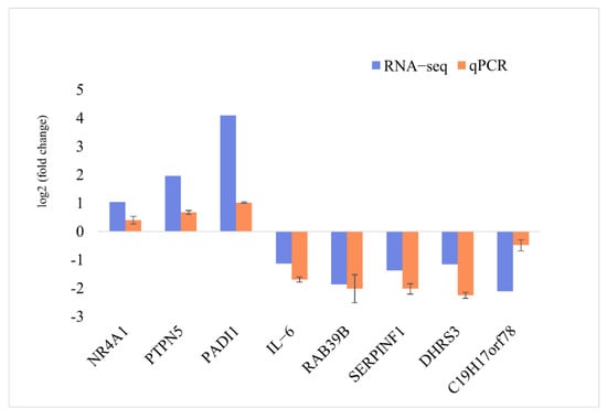 The expression pattern of eight DIE-mRNAs (three up-regulated and five down-regulated genes) based on RNA-seq was validated using qPCR analysis (Figure 4). The qPCR results were consistent with the RNA-seq results, confirming the accuracy and reliability of the RNA-seq results.