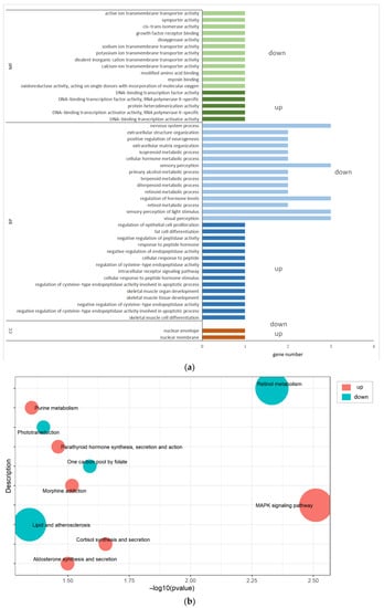 The 63 DIE-mRNAs were annotated to molecular function (MF), biological process (BP), and cellular components (CC) through GO enrichment analysis (Table S4). These DIE-mRNAs enriched nuclear membrane and nuclear envelope under CC. For MF, the DIE-mRNAs enriched DNA-binding transcription activator activity, DNA-binding transcription factor activity, and growth factor receptor binding. However, the enriched BP included regulation of epithelial cell proliferation, intracellular receptor signaling, and extracellular structure organization (Figure 5a). Meanwhile, the KEGG pathway enrichment analysis revealed that the DIE-mRNAs mainly enriched the mitogen-activated protein kinase (MAPK) signaling pathway, retinol metabolism, and cortisol synthesis and secretion (Table S5 and Figure 5b).