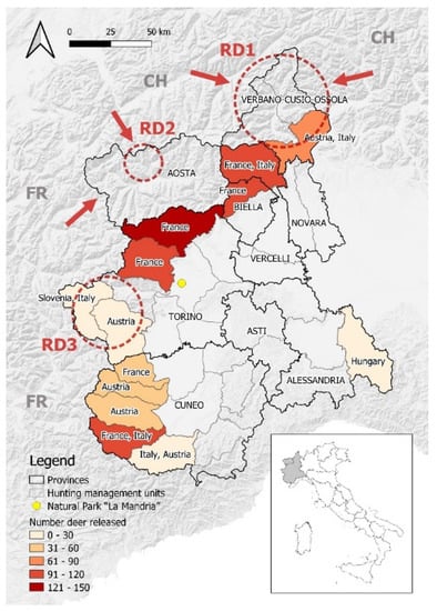 Map of NW Italy showing the hunting management units where RD were translocated between 1962 and 2005. The red circles highlight the areas under passive surveillance for macroscopic external parasites (RD1 = Ossola Valleys; RD2 = Gran S. Bernardo and Valpelline Valleys; RD3 = Susa and Chisone-Germanasca Valleys). Arrows indicate the zones that were initially recolonized by RD migrated from Switzerland (CH) and France (FR). The yellow dot corresponds to the Natural Park of La Mandria. Names of the country in the colored areas represent the origin country of the RD population. Borders of provinces adapted from: Regione Piemonte—A1613B—Sistema informativo territoriale e ambientale (https://www.geoportale.piemonte.it/geonetwork/srv/eng/catalog.search#/metadata/r_piemon:94c85f56-4755-470a-8587-f4644b19ccbd, accessed on 10 March 2022). Borders of hunting management units adapted from: Regione Piemonte—A1709C—Infrastrutture, territorio rurale, calamità naturali in agricoltura, caccia e pesca (https://www.geoportale.piemonte.it/geonetwork/srv/eng/catalog.search#/metadata/r_piemon:d4e3df50-bc23-4be5-8825-b9b2c4b218fc, accessed on 10 March 2022). Hill shades adapted from: OpenMapTiles.org © MapTiler © OpenStreetMap contributors.