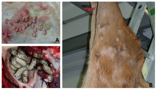 Macroscopic view on Hypoderma diana (A), Onchocerca jakutensis nodules (B), Pharyngomya picta (C) on deer from different areas of Piedmont (see Figure 3).