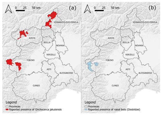 Location (by municipality) of the cases of nodular onchocercosis reported in the surveyed RD populations since the first detection in 2011 (a), and cases of nasal bot infestation in the surveyed RD populations since the first detection in 2018 (b). Borders of provinces adapted from: Regione Piemonte—A1613B—Sistema informativo territoriale e ambientale (https://www.geoportale.piemonte.it/geonetwork/srv/eng/catalog.search#/metadata/r_piemon:94c85f56-4755-470a-8587-f4644b19ccbd, accessed on 10 March 2022). Hill shades adapted from: OpenMapTiles.org © MapTiler © OpenStreetMap contributors.