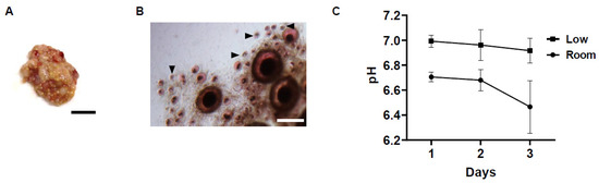 Photograph of average hen ovary utilized for this study, ovarian tissues stained with NR and changes in the pH value of the ovary storage medium. (A) Photograph of hen ovary for examination. Bar = 1 cm. (B) Representative photomicrograph of chicken ovarian tissue (stored for 2 days at low temperature) stained with NR after enzyme treatment. Most follicles were stained with NR, considered as viable. Arrowheads depict uncoloured follicles, considered as dead. Bar = 1 mm. (C) Mean pH (±SEM) changes of media in which the ovaries were stored under different conditions (low temperature, room temperature for 1 to 3 days).