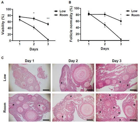 Influence of different storage conditions on follicle viability within ovarian tissues evaluated by neutral red (NR) and histological analysis. (A) Mean (± SEM) percentages of follicle viability in different conditions (low temperature, room temperature for 1 to 3 days). * indicate statistically significant differences (* p < 0.005, ** p < 0.0001) in the percentages of survived follicles. (B) Mean (± SEM) percentages of morphologically normal follicle in hen ovary stored in different conditions (low temperature, room temperature for 1 to 3 days). * indicate statistically significant differences (p < 0.05) in the percentages of morphologically normal follicles. (C) Histomicrographs of ovarian tissue stored in different conditions (low temperature, room temperature for 1 to 3 days). “a” indicates the abnormal follicles. Bar = 100 µm.