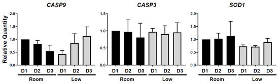 Gene expression analysis showed that expression level of CASP9, an apoptosis marker gene, tended to be higher in the room-temperature group compared to the low-temperature group at the first day of storage (p = 0.56, Figure 3). In the low-temperature group, expression of CASP9 was maintained as low for 2 days of storage but became up-regulated at 3 days. A different apoptosis marker gene, CASP3, did not differ among storage condition and time (Figure 3). The analysis of SOD1 expression, a marker of oxidation stress, indicated a trend of higher expression levels in the room-temperature group than in the low-temperature group (Figure 3). In both conditions, SOD1 expression tended to increase as storage time increased (Figure 3).