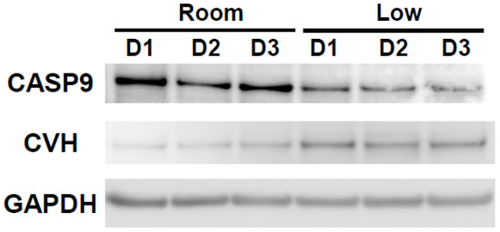 Western blotting analysis revealed higher expression of CASP9 in the room-temperature group than in the cold group, especially on the first day of storage (Figure 4). On the other hand, CASP9 protein expression in the low-temperature group remained low for 3 days of storage (Figure 4). The expression of the germ cell marker, Chicken Vasa Homologue (CVH), was also determined in the ovarian tissues in both group for each storage time (Figure 4).